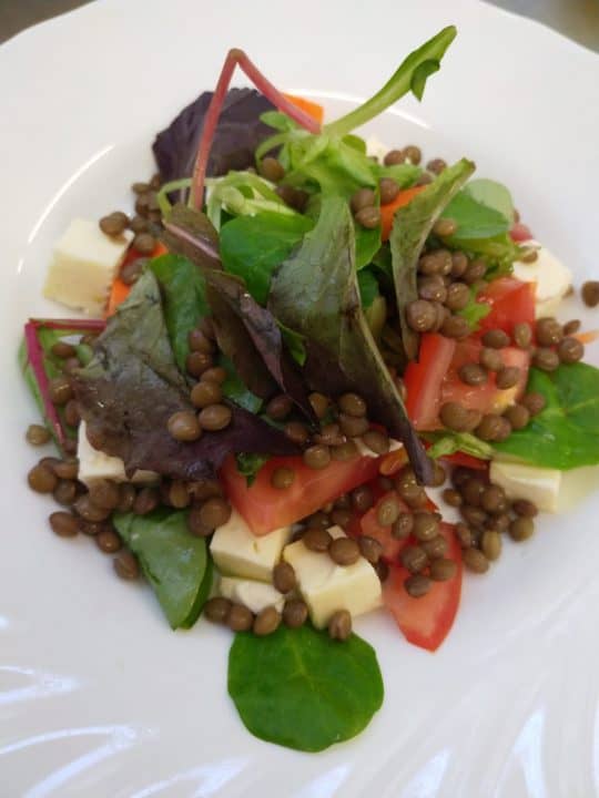 - Wash and chop the lettuce. Wash the rest of the vegetables and cut into mirepoix (1 cm cubes). Cut the feta cheese also into small cubes. Mix all the ingredients together with the cooked lentils. Set aside.