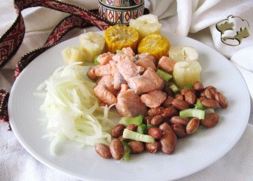 - Cortar la yuca en cilindros de unos 4 cm, cortar las mazorcas en cilindros. Para emplatar colocar el pescado en el centro rodeado por las alubias, cebolla, yuca y mazorcas. Servir