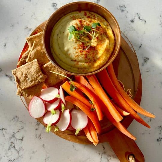- Poner el dip en pequeño bol, rociar un poco de aceite de oliva encima y servir con crudités o galletas de su elección