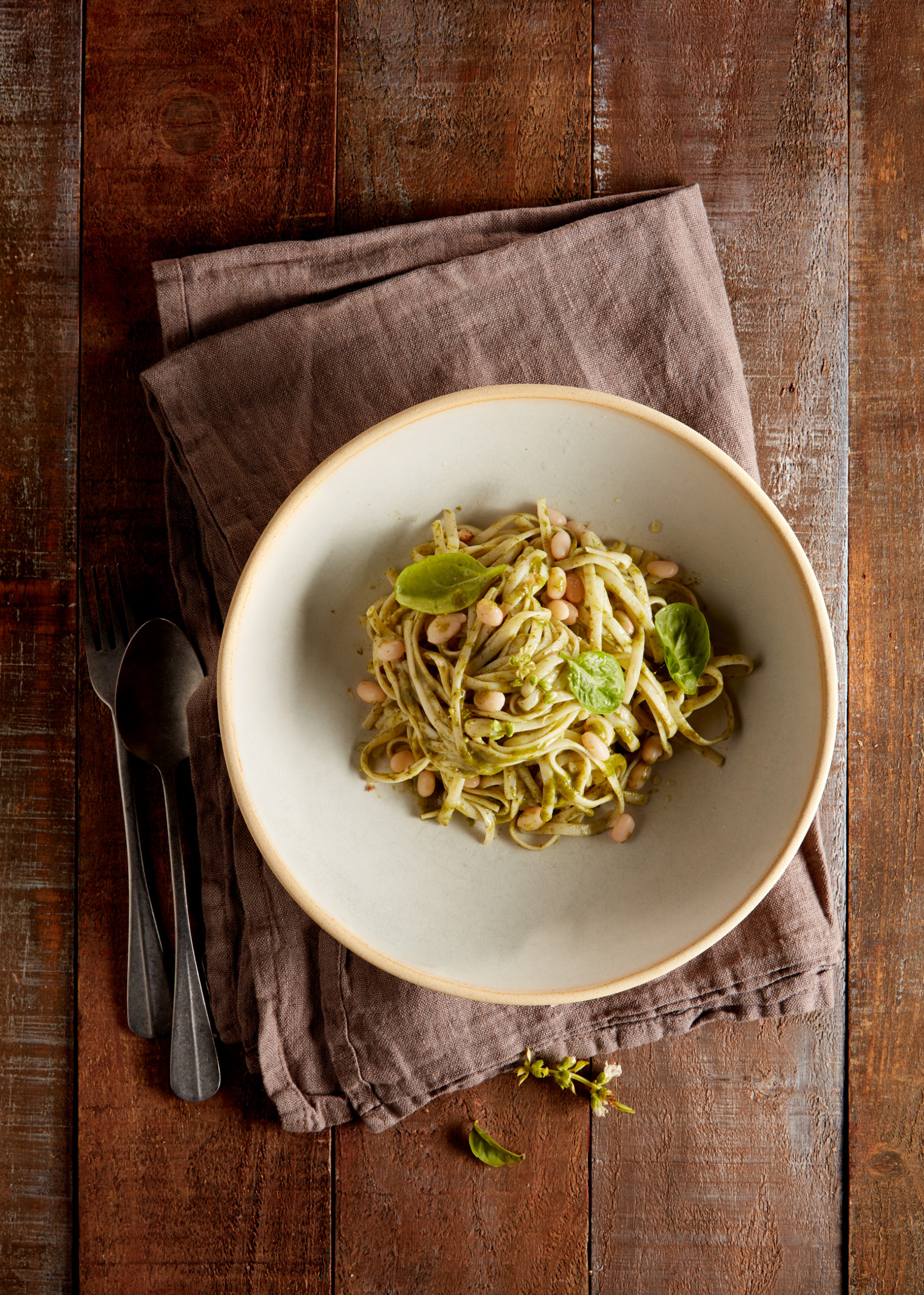 Espaguetis con salsa de espinacas al curry y judías blancas