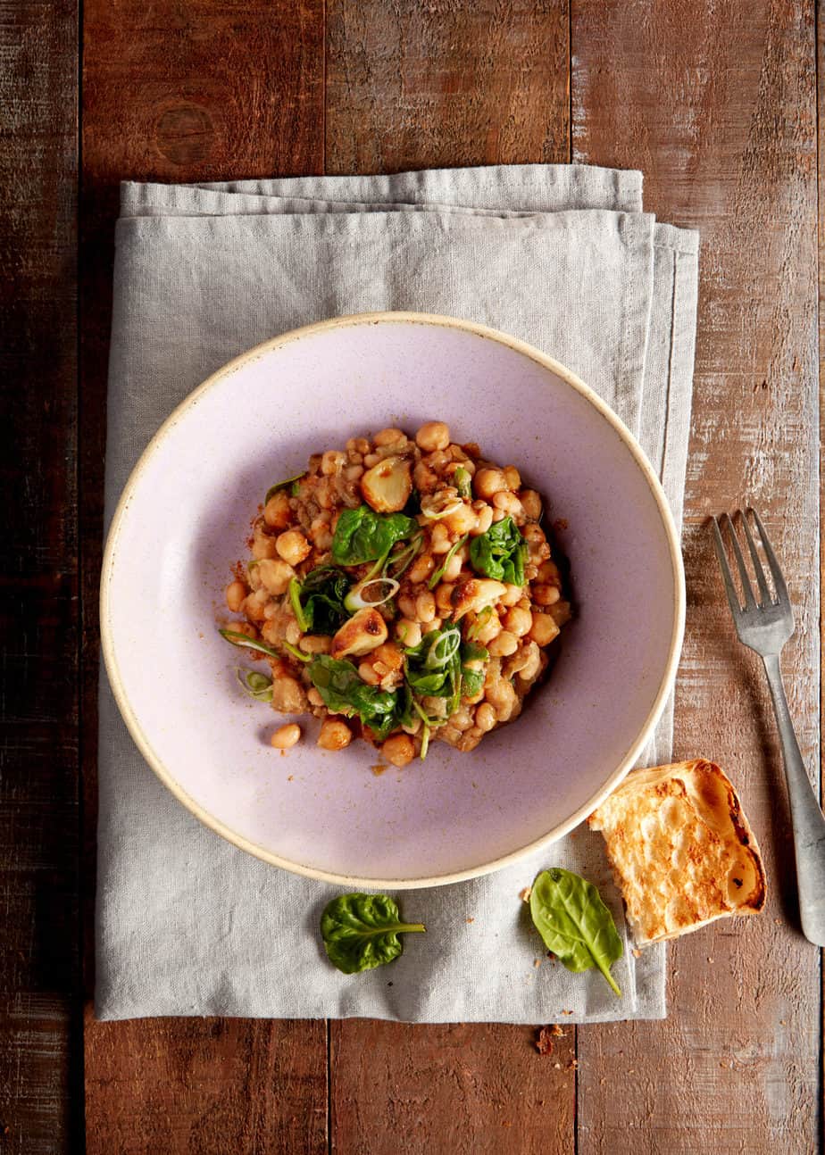 Guiso de alubia riñón, coco ahumado, meloso de calabaza y kale
