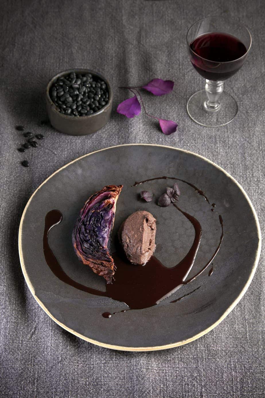 Lombarda asada, puré de judías negras con un toque de anís estrellado y demi-glace de verduras