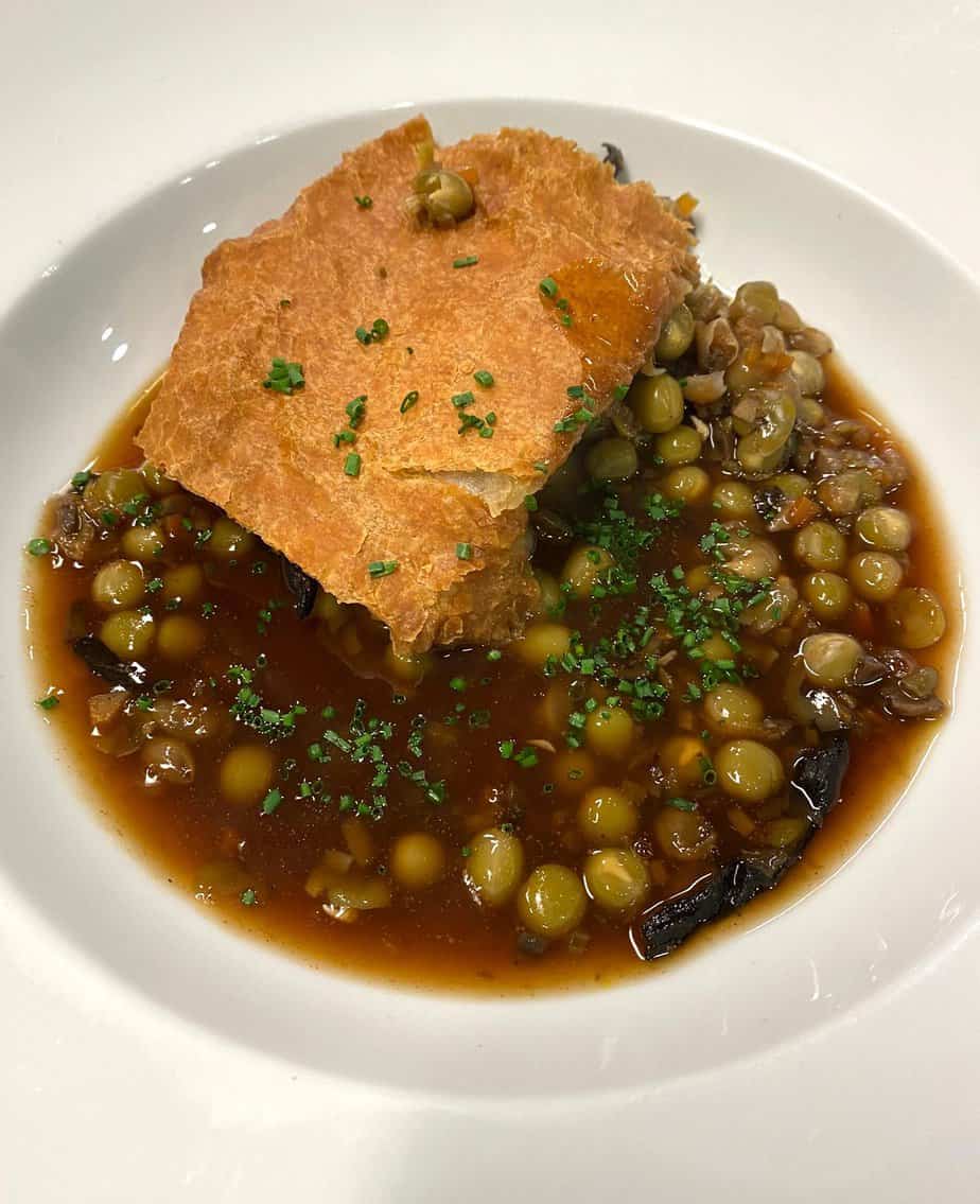 - Caramelizar las verduras en aceite hasta que estén bien doradas. Añadir las hierbas finamente picadas y la cerveza Guinness. Dejar que se evapore el alcohol y añadir el fondo oscuro de verduras. Una vez empiece a hervir, añadir los guisantes secos y bajar a fuego medio.