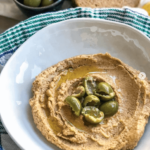 - In the blender, blend the chickpeas, minced garlic, tahini, lemon juice, the eaten, a pinch of salt, 2 tablespoons of olive oil and the pitted green olives.