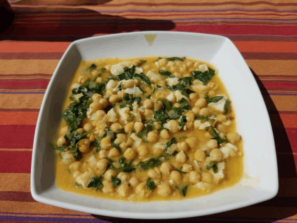 - Aggiungi i ceci cotti, un po’ di brodo di cottura e gli spinaci precedentemente lavati e tagliati. Fai cuocere per 5 minuti e aggiungi il merluzzo tagliato a cubetti, spegnendo il fuoco. Fai riposare per 2 minuti, aggiungi sale se necessario e servi.