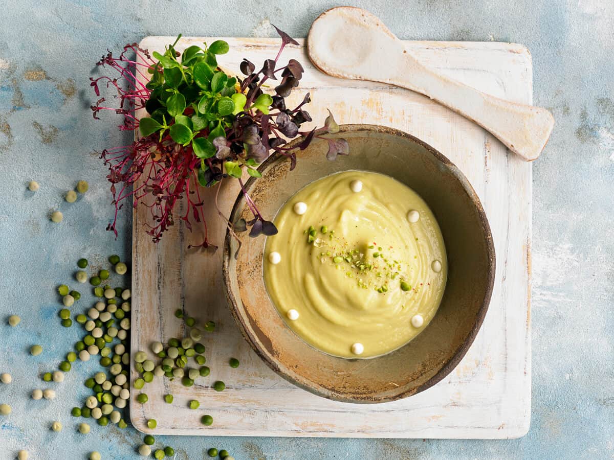 - Cook the peas as indicated on the cooking table. Drain and blend with vegetable drink until obtaining a smooth, silky and homogeneous texture. Add the olive oil to the thread, add salt and pepper.