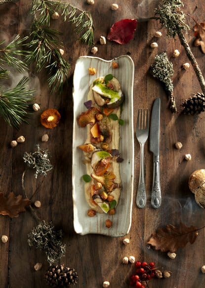 Escabeche de Cogumelos, Hummus Fumado e Grão Crocante